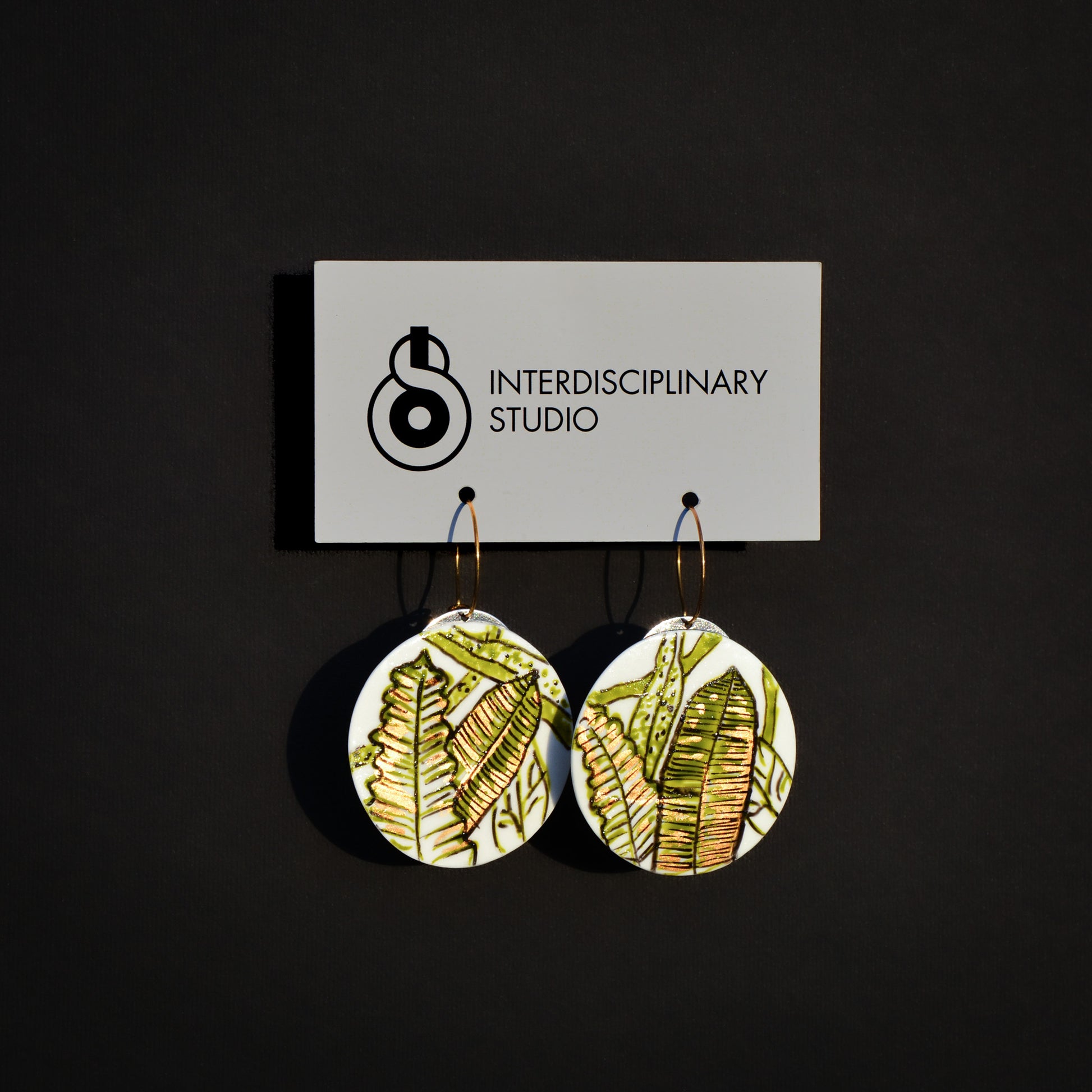 Kolczyki z porcelany na złotych zawieszkach, ozdobione motywem zielonych liści ze złotymi akcentami. Subtelne, a jednocześnie wyraziste - łączą delikatność porcelany z lekko nieformalnym urokiem.