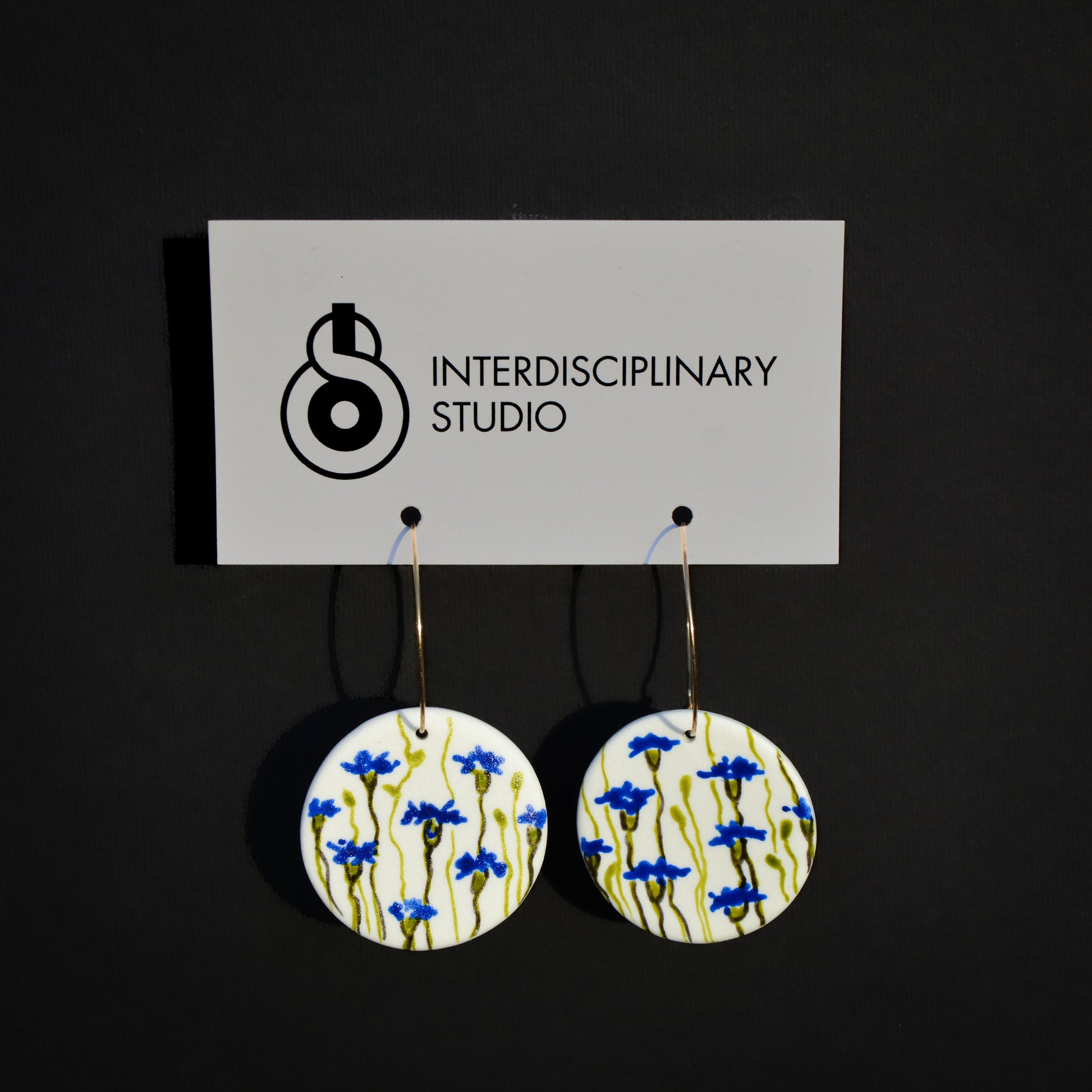 Porcelanowe kolczyki na złotych zawieszkach, ręcznie malowane w motyw niebieskich chabrów na białym tle. Proste, lekkie, z subtelnym, malarskim charakterem. Dla osób, które lubią spokojną, ciepłą biżuterię z nutą natury.