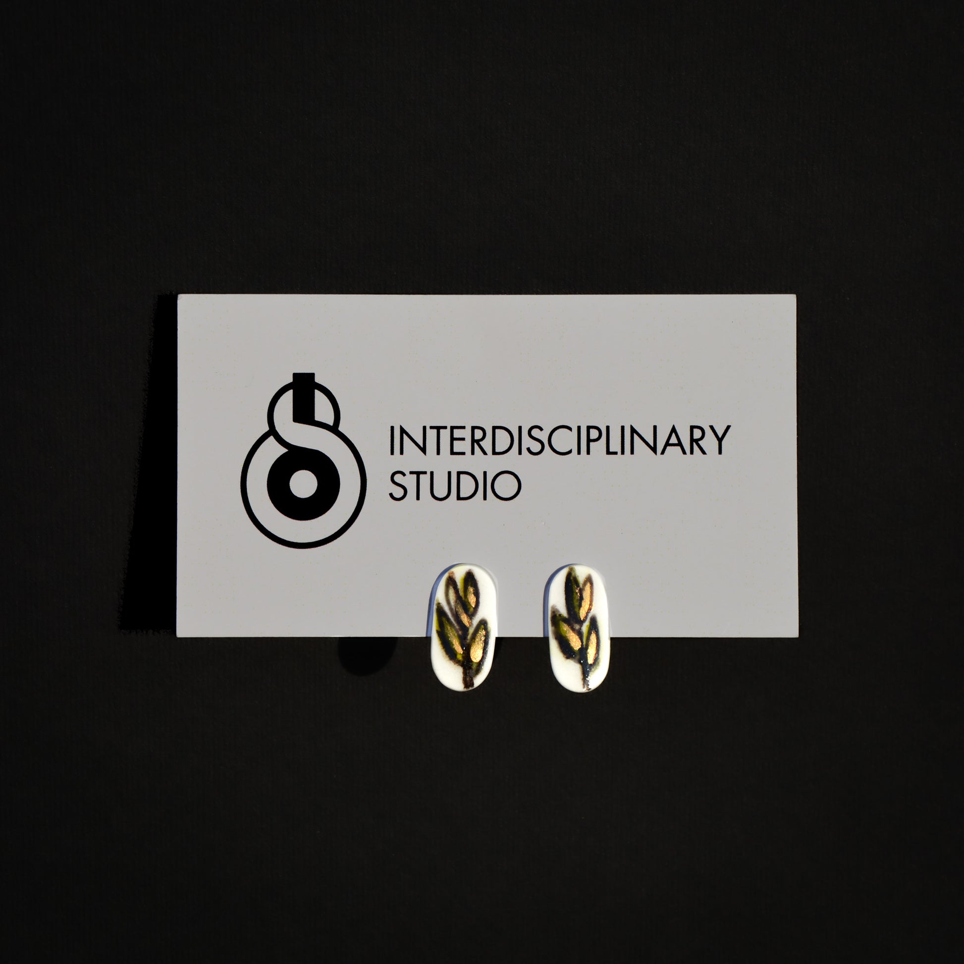 Drobne porcelanowe kolczyki o delikatnie wydłużonym, obłym kształcie. Na białym tle ręcznie malowany złoty motyw roślinny - prosty, subtelny, przywołujący skojarzenia z drobnym kwiatem lub źdźbłem pszenicy. Bardzo lekkie i minimalistyczne.